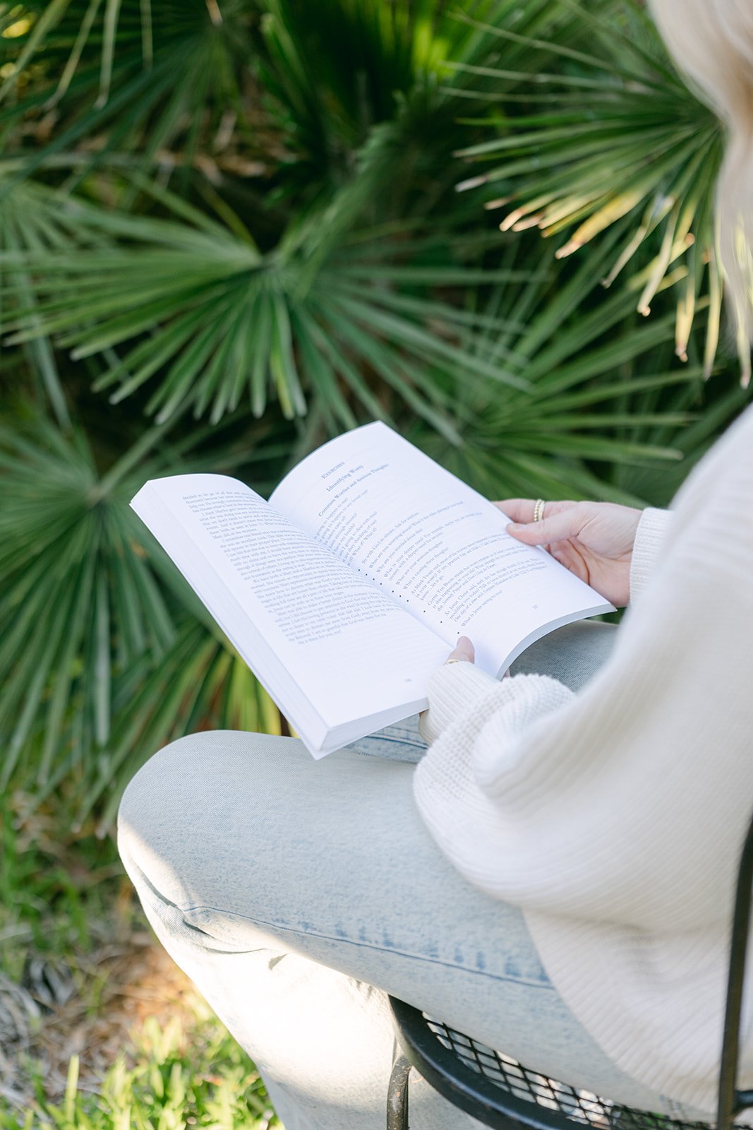 Person sitting on a chair outdoors reading a book, surrounded by green plants with long, pointed leaves.